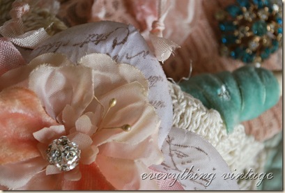 So therefore, I have used vintage pink flowers, vintage velvet, vintage laces, and vintage pieces ... all strategically combined with pink and aqua ;)